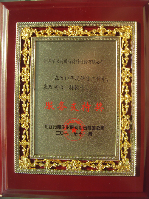 2012年,我公司憑借優(yōu)質(zhì)的產(chǎn)品質(zhì)量和服務(wù)得到江蘇萬(wàn)邦生化醫(yī)藥股份有限公司的認(rèn)可,并授予“服務(wù)支持獎(jiǎng)”。